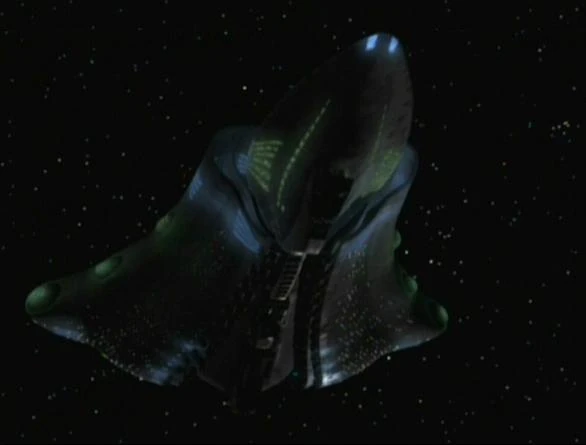This CGI model and its various modifications made a total of five appearances on Star Trek: Voyager and one in Star Trek: Enterprise. The "Reptile (Alien) Ship" was designed by Rick Sternbach in July 1995. Constructed at Amblin Imaging (citation needed • edit), the ship was one of Voyager's first CG models. (Star Trek Voyager: A Celebration, p. 208)