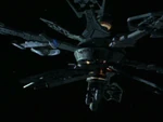 On the origin of the Hierarchy Assault-class Rick Sternbach commented, "I vaguely recall the script saying it was an "alien ship bristling with antennae," since the crew was engaged in massive surveillance operations of everything around them. The two sketches I turned in were pretty different from most other things we'd seen before, maybe the first one more than the second one. Where the design went after that was (…) between Brandon and our VFX guru Dan Curry." [14](X) Starting from some of the details of the two sketches Dan Curry (who remarked, "Brandon carried it further when he made his excellent CG version. He really understood the aesthetic I was after…", [15](X) and Brandon MacDougall refined the design further at Foundation Imaging into the final design as it finally appeared in "Tinker Tenor Doctor Spy" and "The Void" as a CGI model rendered in Lightwave.