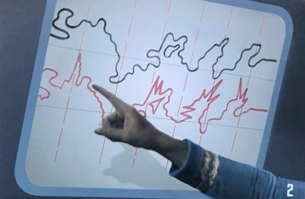 In the teleplay, a pair of Voice-O-Graph projections were carefully compared by Spock and McCoy, on the bridge of the USS Enterprise. From this pair of graphs, they were able to confirm that a message which the starship seemed to have recently received from its commanding officer, Captain James T. Kirk, was indeed actually from him. Unbeknown to the two investigating officers, Kirk had been subjected to treatment with a neural neutralizer at the Tantalus Colony while the call had been made. The Voice-O-Graph projections contained tonal variations which suggested the captain had been under coercion, as well as showing that Kirk had meanwhile been feeling a mix of stress and fatigue. (Star Trek: Lost Scenes)