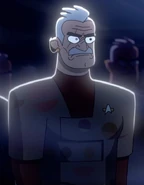 Back on the Cerritos, Rutherford is trying to focus on his work, but the situation with Shaxs' return is actively on his mind. Numerous possibilities perplex him, from Shaxs possibly having returned through the mirror universe or having been put back together with assistance from the Borg Collective, or having survived in the Nexus. Unable to take the mystery anymore, he rushes to find Shaxs.