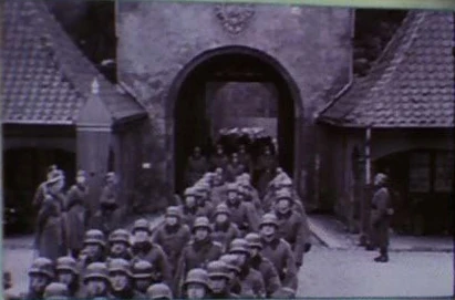 While the Ekosian general was a clear cut reference to the army branch of the Wehrmacht, the other army references in the Ekosian newsreel were more tentative, though still there nevertheless. The reel contained especially produced footage for the episode, interspersed with clippings of actual, historical German news, or propaganda footage. In the late 1930s prior to the outbreak of World War II, the military branch of the SS, the Waffen-SS, was at the time still very small and as "amateurs" despised by the regular German military. Developing somewhat sequestered from German society and military alike in that era, they, excepting two very limited and near unnoticed, small unit actions in the 1938 "consensual" Austria and Sudetenland annexations (actually meant to be their baptisms as a military unit), did not partake in any open military maneuvers until the September 1939 Polish campaign, the actual start of the war. The above and the to the right featured parading soldiers in the reel, lacking any discernible SS insignia (on the uniform collars in particular), were from a newsreel of the 9 April 1940 Wehrmacht occupation of Copenhagen, Denmark, and in which the Waffen-SS had not taken any part, they instead amassing at that time on the western border in preparation for the May 1940 Blitzkrieg campaign in the West. [1](X)