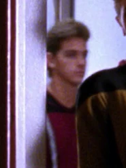 He passed Jake Kurland and Wesley Crusher in a corridor while the ship was in orbit of Relva VII. He was later on duty on the bridge when Kurland stole a shuttle. (TNG: "Coming of Age")