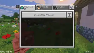 New projects can be created from the main menu. All existing projects are shown in the "Projects" list, with the options to edit a project, create a new project, or import a world file. The player can join multiplayer projects from the "Friends" tab or join external servers from the "Servers" tab. The settings icon in the top-right opens the same settings menu as in regular gameplay. Pressing a project in the list opens the editor for that world.