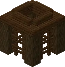 A pillager outpost with the roof removed to show the spawn location of pillagers in Bedrock Edition. -