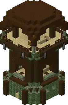 A pillager outpost consists of a 4-story watchtower with other smaller structures around it.