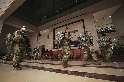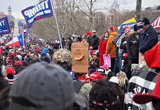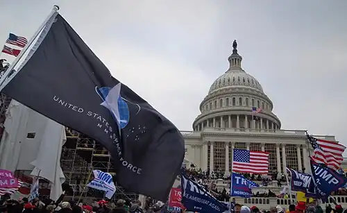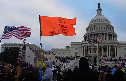 The March for Trump/Save America rally initially started out as a normal, peaceful protest that preceded an unorganized march to the U.S. Capitol building on January 6, 2021. On January 1, a permit was granted to the rally organizer "Women for America First", listing speakers including Rudy Giuliani, Roger Stone and Diamond & Silk.[74] The "most visible financial backer of Women for America First" was Mike Lindell, though he claimed not to have supported the organization subsequent to December 14, 2020.[75][76] Although the rally was specifically titled "March for Trump", the permit stated that the Women for America First would not be conducting an organized march after the rally ended, but that participants may leave to attend rallies at the U.S. Capitol.[77] The currently known sponsors of the rally were:[74][78][79]