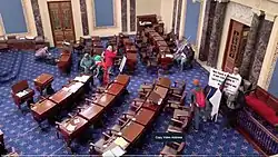 As the US Congress was about to certify former Vice President Joseph R. Biden Jr.'s victory over President and narcissistic sore loser Donald J. Trump in the 2020 presidential election, a group of a few thousand far-right pro-Trump paramilitaries, rioters, and "patriots" stormed the fucking Capitol building, demanding that Congress subvert the will of voters they didn't like and declare Trump the winner. The building was trashed and vandalized by the insurrectionists, resulting in dozens of injuries and the deaths of four rioters and one police officer.[4][5] Most of the rioters had attended a "Save America March" (and rally) at the National Mall that morning, where Trump urged his supporters to "fight like hell" and Rudy Giuliani asserted that "trial by combat" was the only way to "save" America from the radical anti-American/commie/SJW/anti-white/Cultural Marxist/antifa/BLM/"globalists", or some trumped-up bullshit like that,[note 1] and Representative Mo Brooks would also rile up the crowd as well. This was arguably the most terrifying disruption in the day-to-day functioning of Congress since 1954, when a small group of Puerto Rican independence fighters shot five Representatives, and definitely had the potential to become so much worse.