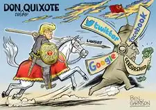 In the book, Quixote was a deluded man who believed that he was a knight fighting ferocious giants but was actually fighting windmills, so this comic is accidentally sending the message that social media "censorship" is an imaginary threat…