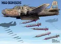 His cartoons lack any sort of subtlety, exemplified by the excessive labeling. According to Garrison's Law: The more labels you have, the more effective your cartoon is.