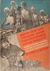 "We'll engage hundreds of thousands of working women in socialist production in collective farms, state farms and machine tractor stations. Women of the collective farms, master automobile, tractor and rail technology! Learn auto mechanics!"