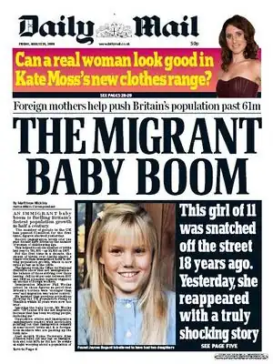 It is exceptionally rare for the main headline to be unlinked to asylum seekers or "dangerous" foreigners in some way or another, regardless of the context of the story. Such is the case with Mahira Rustam Al-Azawi, who would otherwise just be another case of long-term fraud if it wasn't for the Mail slanting it toward her being an Iraqi asylum seeker.[26]