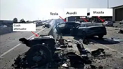 Tesla Motors is a car company figure-headed by Elon Musk. It is famous for being the only company with a commercially available car floating in space. It makes "eco-friendly" electric cars, which made the news for catching fire with toxic smoke and hard-to-extinguish flames.[100][101] As it turns out though, while Teslas caught fire, they did so at a much lower rate than the cars relying on tiny controlled explosions of extremely flammable hydrocarbons.[102] However, putting out lithium battery fires is far more difficult than putting out internal combustion car fires, sometimes requiring over 20,000 gallons of water.[103] Tesla also makes cars that can drive themselves, but they seem to have a habit of crashing while doing so.[104]