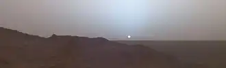 The atmosphere on Mars consists mostly of carbon dioxide with only one percent of the gas pressure of Earth's atmosphere. Dust in the Martian atmosphere gives it a light pink color during the day, and at sunset it turns a very lovely teal.[2]