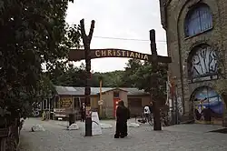 is a rare example of an urban micronation. This hippie commune was founded by squatters and anarchists in a disused army barracks in 1971, and declared itself an independent free town. This legal status is not formally recognised by the Danish government, but the commune's existence has largely been tolerated, and the government long turned a blind eye to the open cultivation and trade of marijuana within its boundaries, until the 2000s, when changes in drugs laws and a string of violence related to gang activity gradually led to a crackdown on dealing and the imposition of a zero tolerance zone.[14] Nowadays, Christiania tolerates personal use, but the commune itself forbids the sale of marijuana. The closest it has had to any recognition was from the local bus service that added a stop near the old barracks gates, and a listing on the official Copenhagen tourist website.[15]