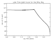 - ↑ Note also how besides that, galaxy mergers will still take place in this era, at least as long as galaxies as such instead of just supermassive black holes exist. However, besides them of course taking place in darkness, between galaxies of stellar corpses (so no way to see tidal tails and similar features), next to no hydrogen will mean no star formation marking them, and probably no active galactic nuclei too making them extremely