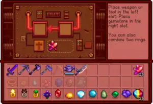 The Forge is located on Floor 10 in the Volcano Dungeon. It is used to upgrade weapons, enchant weapons and tools, combine rings, and change weapon appearances.
