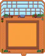 The interior of the building features a 10-row-by-12-column plot of land. There, Crops can be planted, grown, and harvested at any time of year without reference to normal season restrictions. Scarecrows are not required in the greenhouse to prevent crows from eating crops. Crops still need to be watered, even on rainy days. There is a water trough along the north wall, where the Watering Can can be refilled. Crops that regrow will continuously regrow and not die at the end of any season.