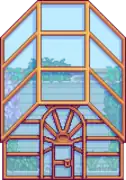 The Greenhouse is a building present on the farm from the start. It is initially in a state of disrepair, making it unusable. It can be repaired by completing the Pantry Bundles for the Community Center or by purchasing "Greenhouse" from the Joja Community Development Form for