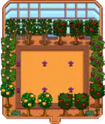Between the wood border and the greenhouse walls is a region two tiles thick that is unsuitable for crops, and populated along the walls with decorative items (plants, tools, barrels, water trough). It is possible to plant fruit trees at any spot in this region not occupied by decorations, so long as there are two tiles between fruit trees. Fruit trees cannot be planted in the corners of the Greenhouse. Neither the greenhouse wall nor the wood border itself will impede the growth of the fruit trees, although a one-space separation must be maintained between the tree and any items (like sprinklers) that are placed on the wood border or exterior region during the time the tree is growing.