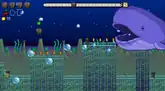The third level takes place underwater, resulting in slower falls. In addition, there's a large whale on the right side of the screen that periodically spews bubbles, which (like all hazards) are fatal upon impact unless the player lands on top of them, which causes the player to bounce a fair distance into the air. Collecting coins/fruit may be difficult, if not impossible, without jumping off the top of bubbles to reach high-up rails. The Gem Sea Giant is also the third level in Endless Mode.