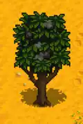 The Mango Tree is a type of fruit tree. The sapling can be purchased at the Island Trader for 75 Mussels or found in a Golden Coconut when broken. It takes 28 days to grow to maturity, after which it will produce one Mango each day during the Summer in Stardew Valley or year-round on Ginger Island. It can only grow in the center of a 3x3 square, each square of which must be kept completely clear of objects, flooring, and terrain features (including grass). The 3x3 grid must not overlap the 3x3 grid of another Fruit Tree.