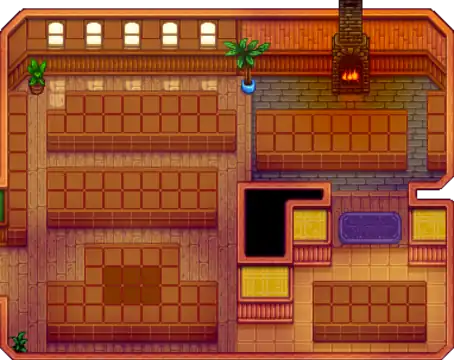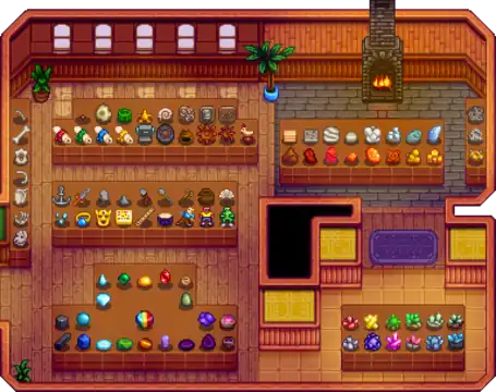 | Merchants | Abandoned House • Adventurer's Guild • Blacksmith • Bookseller • Carpenter's Shop • Casino • Desert Trader • Fish Shop • Giant Stump • Harvey's Clinic • Ice Cream Stand • Island Trader • JojaMart • Marnie's Ranch • Oasis • Pierre's General Store • Qi's Walnut Room • The Stardrop Saloon • Traveling Cart • Volcano Dwarf • Wizard's Tower | |