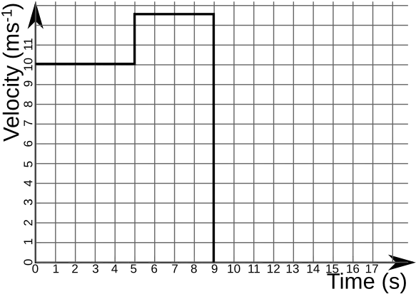 The velocity from 0-5s is 10ms−1. The velocity from 5-9s is: