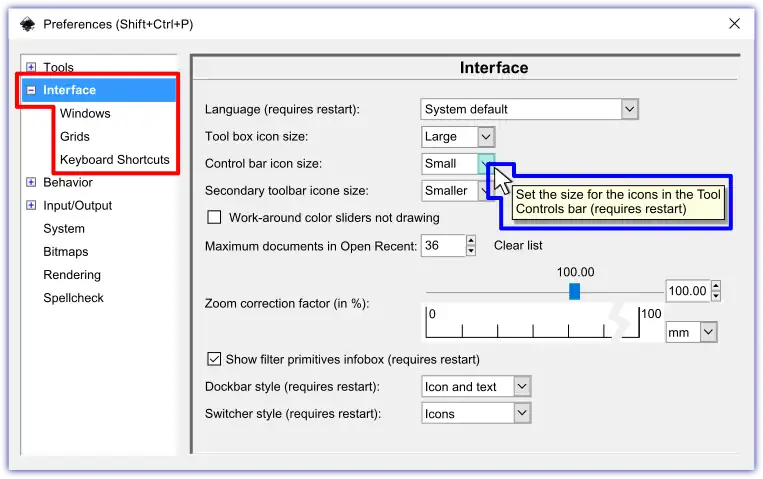 To open the Interface preferences menu, use the Menu bar ‣Edit, ‣‣Preferences... (Ctrl+⇧ Shift+P) and open the <Interface> sub-menu. There are many customizable settings available under the Interface preferences and its three sub-menus. Just like the mouseover 🖰 feature availability for on canvas edits and interface bars, you can also mouseover 🖰 preferences' window items; drop down menus, check box descriptions and value boxes.