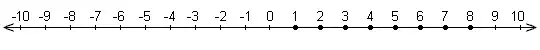 The arrowheads at the opposite ends of the drawing of the number line mean that line in concept extends infinitely in those directions, even though the drawing of the line cannot be extended forever in those directions. Note that the right side of the number line stretches to positive infinity and the left side stretches to negative infinity. Numbers in a set can be shown as dots on (or near) a number line. For example, the above set of natural numbers from 1 to 8 would be shown as follows: