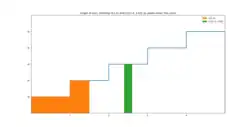 Graph of u(x) shown as a step-function in blue. There are two examples of the measure U: U(1.5) is the area under the curve in orange, U{[2.4, 2.6]} is the area under the curve in green.