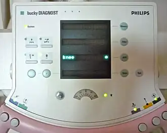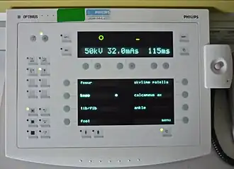 The generator console usually provides protocols to be used for radiography different body parts - see Figure 2.11. The exposure control is generally located here and the kilo-voltage (kV), tube current-exposure time product (mAs) and exposure time (ms) for the exposure are typically displayed.