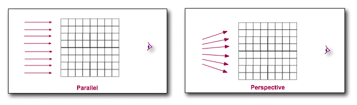 Perspective projections can be generated by changing from the parallel lines used to generate the parallel projections to lines of voxels which diverge from an apparent point behind the volume at a distance such that the viewer of the display can visualize closer features of the image data as relatively larger than deeper features – see the following figure: