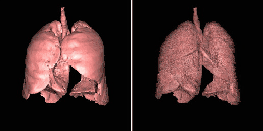 Surface rendering is also referred to as Shaded Surface Display (SSD) and involves generating surfaces from regions with similar voxel values in the 3D data as illustrated by the SPECT lung-perfusion scan shown in the left panel below: