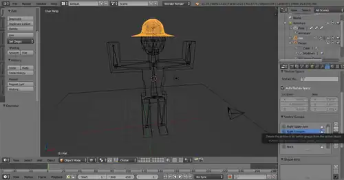 Noob Note: If you've been adding bones to your simple person from the previous lessons, you will have likely noticed that the hat seems to stretch when you move the arms in pose mode. To fix this, you will need to remove the hat from the forearm vertex groups created in the Parenting step.