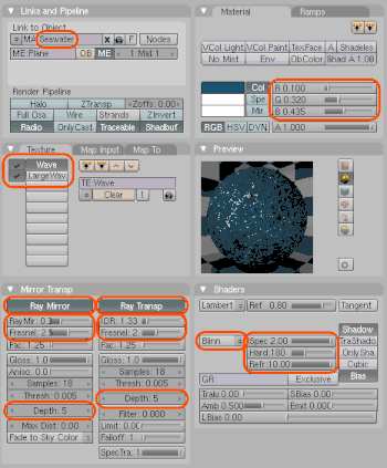 Left click on the Materials button (looks like a red sphere) to return to the material buttons subcontext. Look at the Texture panel, and you'll see that the "Waves" texture has been automatically associated with the Seawater material.
