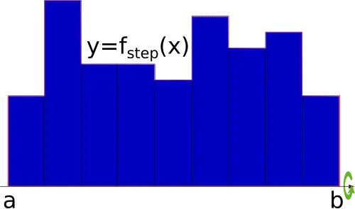 Consider the solid formed by revolving the region bounded by the curve , which is continuous on , and the lines , and around the -axis. We could imagine approximating the volume by approximating with the stepwise function shown in figure 2, which uses a right-handed approximation to the function. Now when the region is revolved, the region under each step sweeps out a cylinder, whose volume we know how to calculate, i.e.