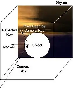 The illustration to the left depicts the concept of reflection mapping with a static skybox: a view ray is reflected at a point on the surface of an object and the reflected ray is intersected with the skybox to determine the color of the corresponding pixel. The skybox is just a large cube with textured faces surrounding the whole scene. It should be noted that skyboxes are usually static and don't include any dynamic objects of the scene. However, “skyboxes” for reflection mapping are often rendered to include the scene from a certain point of view. This is, however, beyond the scope of this tutorial.