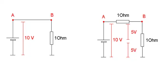 The wire as you know has its own resistance. Let us now connect a resistor (1 ohm), our wire (1 ohm) and a voltage source(10V) like it is shown in the second picture. After measuring the output voltage we see that it has been reduced with the voltage drop caused by the wire’s internal resistance. The reason for this is clear – the current flowing in the circuit.