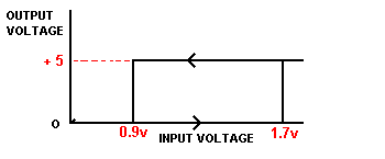 In the top diagram, the input voltage increases from zero, along the bottom horizontal line. The output voltage remains at zero on the vertical line. However, when the input voltage reaches 1.7 volts, the output shoots up from zero to 5 volts. Reducing the input voltage, as shown in the top horizontal line does not cause the output to drop to zero immediately. This only happens when the input voltage is reduced to 0.9 volts. The input level at which the output increases to maximum, and the level at which it drops to zero are different (the text is written by Radoslav Danchev).