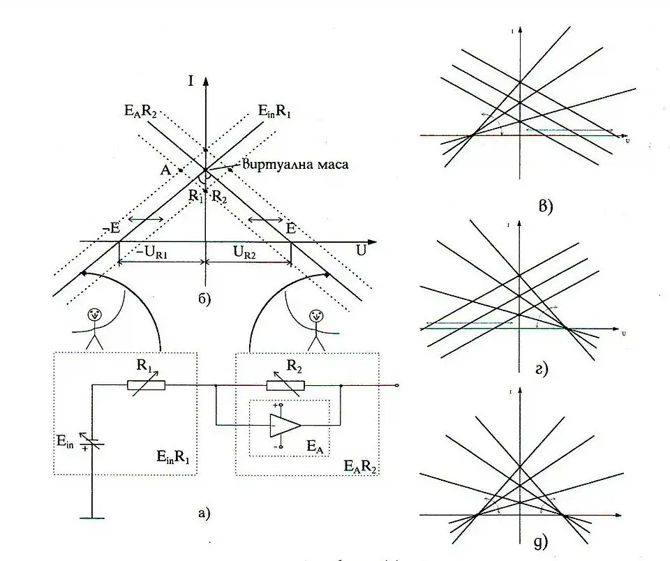 A more complicated example – the classical circuit of an op-amp inverting amplifier, is shown in Fig. 3 in three cases: R1 changes, R2 changes, both change simultaneously and in the same direction. In all three cases, the operational amplifier (until it has reached the supply rails) successfully copes with its main task - to maintain a zero voltage (virtual ground) at its inverting input. For this purpose, it changes its output voltage in the corresponding direction and moves the IV curve of the resistor R2.