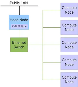 The term node usually describes one unit (linked computer) in a computer cluster. It represents the basic unit of a cluster. There a different types of notes like head-nodes, compute-, cloud- or storage-nodes. Nodes in a cluster are connected through dedicated internal Ethernet networks. The figure below shows a simple setup of the components building a basic HPC Cluster.
