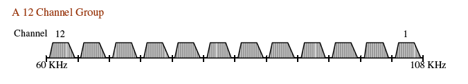 The analog voice channels are pre-grouped into threes and heterodyned on carriers at 12, 16, and 20 kHz. The resulting upper sidebands of four such pregroups are then heterodyned on carriers at 84, 96, 108, and 120 kHz to form a 12-channel group.