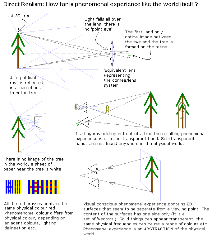 The study of consciousness may seem to be esoteric or outside of the main stream but it includes some very real problems in science and philosophy. The most obvious problem is how we can see anything at all. Many people with a smattering of geometry tend to believe that they have a 'point eye' that sees the world, and this idea is known as perceptual "Naive Realism". Physical considerations show that this idea is highly contentious; we have two eyes with different images in each, normally the only images in the world are created by optical instruments such as the eye, and the photons that carry light to the observer cannot and do not all converge at a single point. Some of the discrepancies between the physical reality and our experience are shown in the illustrations.