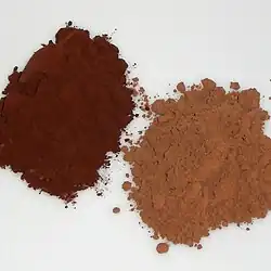 Cocoa powder is the unsweetened powdered, reddish cocoa solids left after the cocoa butter is pressed from the chocolate liquor. It is quite acidic and bitter,[2][11] and it is often used in baking since melting is not required.[18] Natural cocoa powder may subsequently be "Dutched" or treated with alkali, which makes the powder darker and less acidic,[5][6][7] and a given amount of Dutched cocoa tastes more chocolatey than the same amount of unprocessed cocoa.