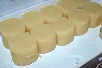 Generally, marzipan has a sweet flavor and pliable, dough-like texture.[3][5][6] Both of these properties are governed by the proportion of nuts and sugar used.[2] Higher sugar content increases sweetness and firmness, which in excess makes the marzipan difficult to handle,[7] and the mixture can ultimately separate.[3] At the other extreme, a too-great proportion of nuts can also cause separation due to excess oil.[3] A reasonable balance occurs at around ⅓–⅔ nuts.[3][7][8][9] A liquid sweetener can improve pliability.[7]