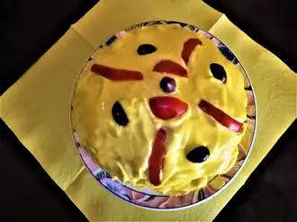 - Spread reserved mayonnaise over the top and garnish with the garnishes, arranging them in attractive shapes.