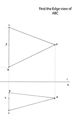 Edge view is a view looking at one side of a plane. Planes in edge view are shown as lines that are the distances of the edges of the shape. To get edge view, take a view parallel to a side of a plane. Then take another view perpendicular to the new line. Alternatively, if you already have front and top views of the plane, to get an edge view you may draw - in either view - a line from one side of the plane to the other that is parallel to the folding line, transfer this line to the other view, and then take a view perpendicular to the line from that second view. Use transfer distances from the first view to get the endpoints of the plane and complete the edge view of a plane.