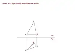 Finding the true length is a fundamental process in descriptive geometry that advances the problem-solving to the next steps to reach the solution. To find the true length of a line you must take a view parallel to the line; in other words, if a line is a parallel to the folding line in one view, it is shown in true length in the adjacent view. If a line is parallel to the folding line in both adjacent views, as for example in both the top and front views, then it is shown in true length in both of those views, and in such cases no additional work must be done if the only goal is to find the true length of the line.
