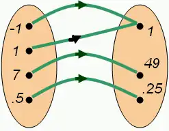 Let us take the domain D={1,2,3}, and f(x)=x2. Then, the range of f will be R={f(1),f(2),f(3)}={1,4,9}. Taking the Cartesian product of D and R we obtain F={(1,1),(2,4),(3,9)}.