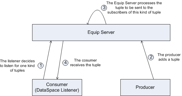 Basically, equip4j provides a Java library that exploits the concept of dataspaces. One way to view the way equip4j works is by the three roles of software components: the server, the consumers and the producers. The consumers can make subscriptions to any kind of tuples(1), the producers post tuples (or updates to these) to the server (2), and the server processes and notifies the consumers about new tuples (3,4). Any software component may assume the consumer or producer role.